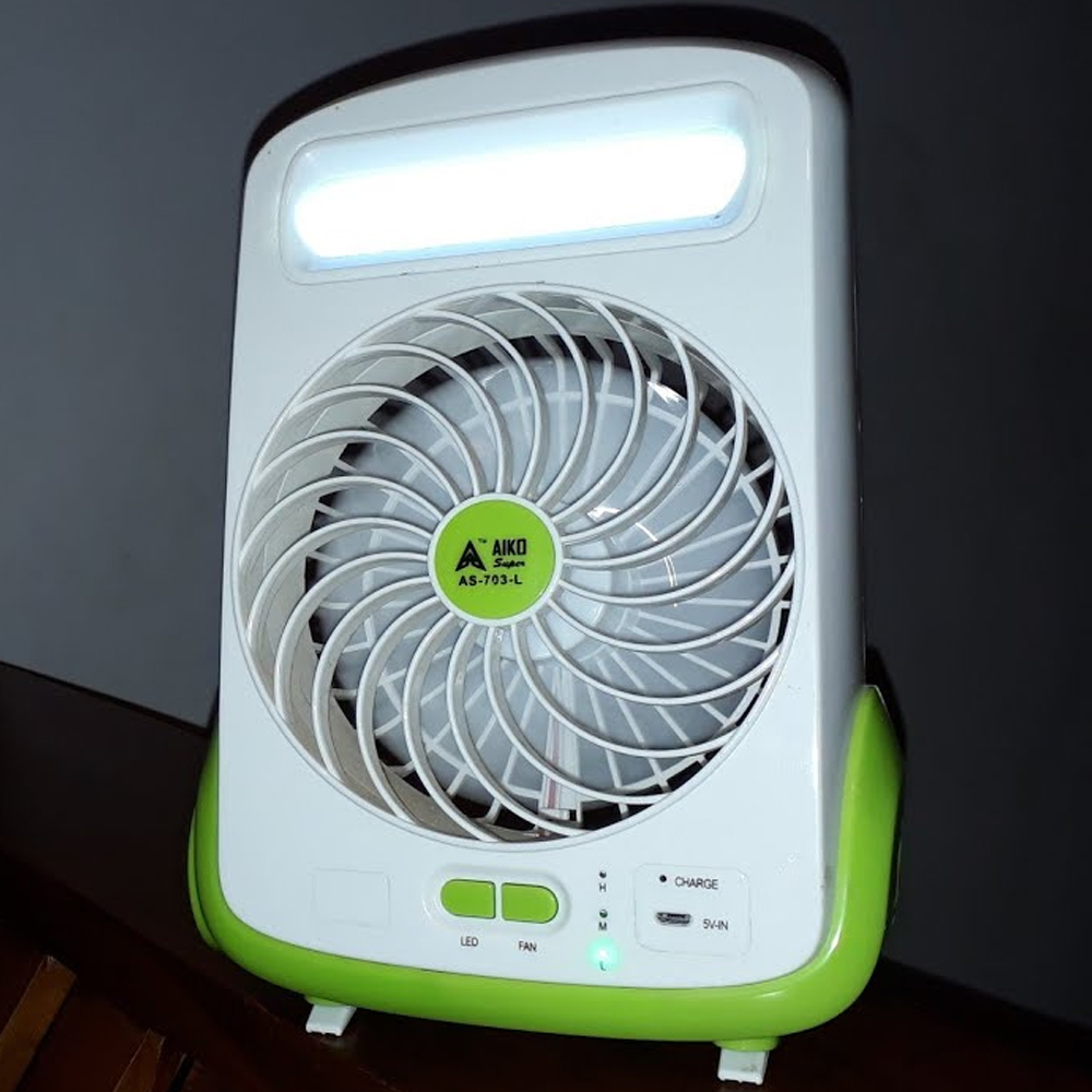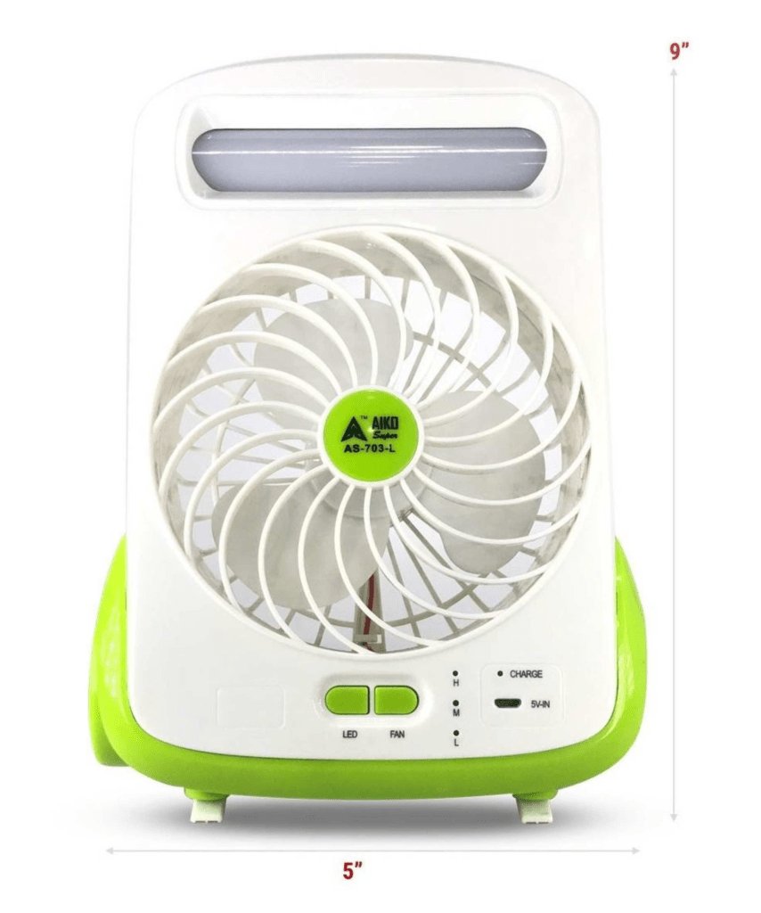Rechargeable Mini Desk Fan Fan size: 9 x 5 inches Built In LED Light & Torch Light Duration: Up to 4 hours Torch Duration: Up to 9 hours Fan Duration: Up to 4.5 hours.