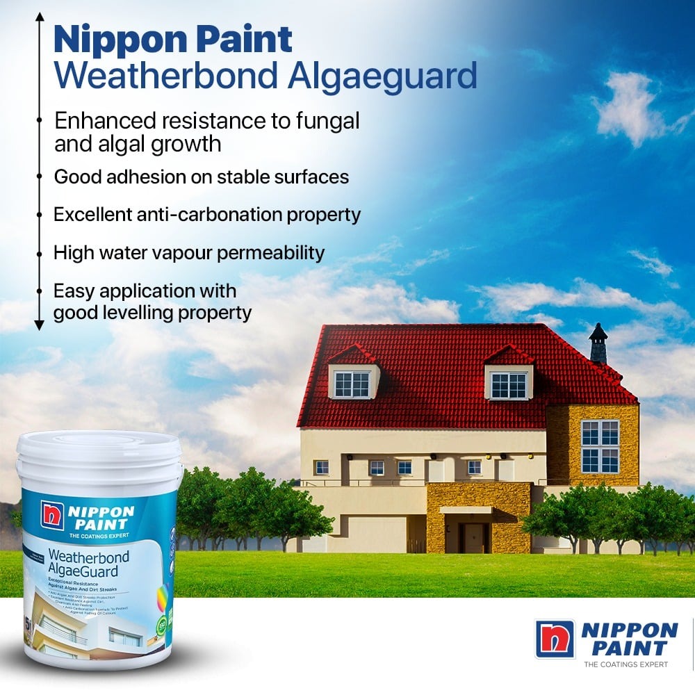Nippon Weatherbond AlgaeGuard is a long lasting high performance water-based acrylic exterior paint specially formulated with enhanced anti-algae and anti-streak marks performance . It provides ultimate protection to your walls against harsh weather conditions such as the extreme heat and rain experienced in tropical countries like Sri Lanka.