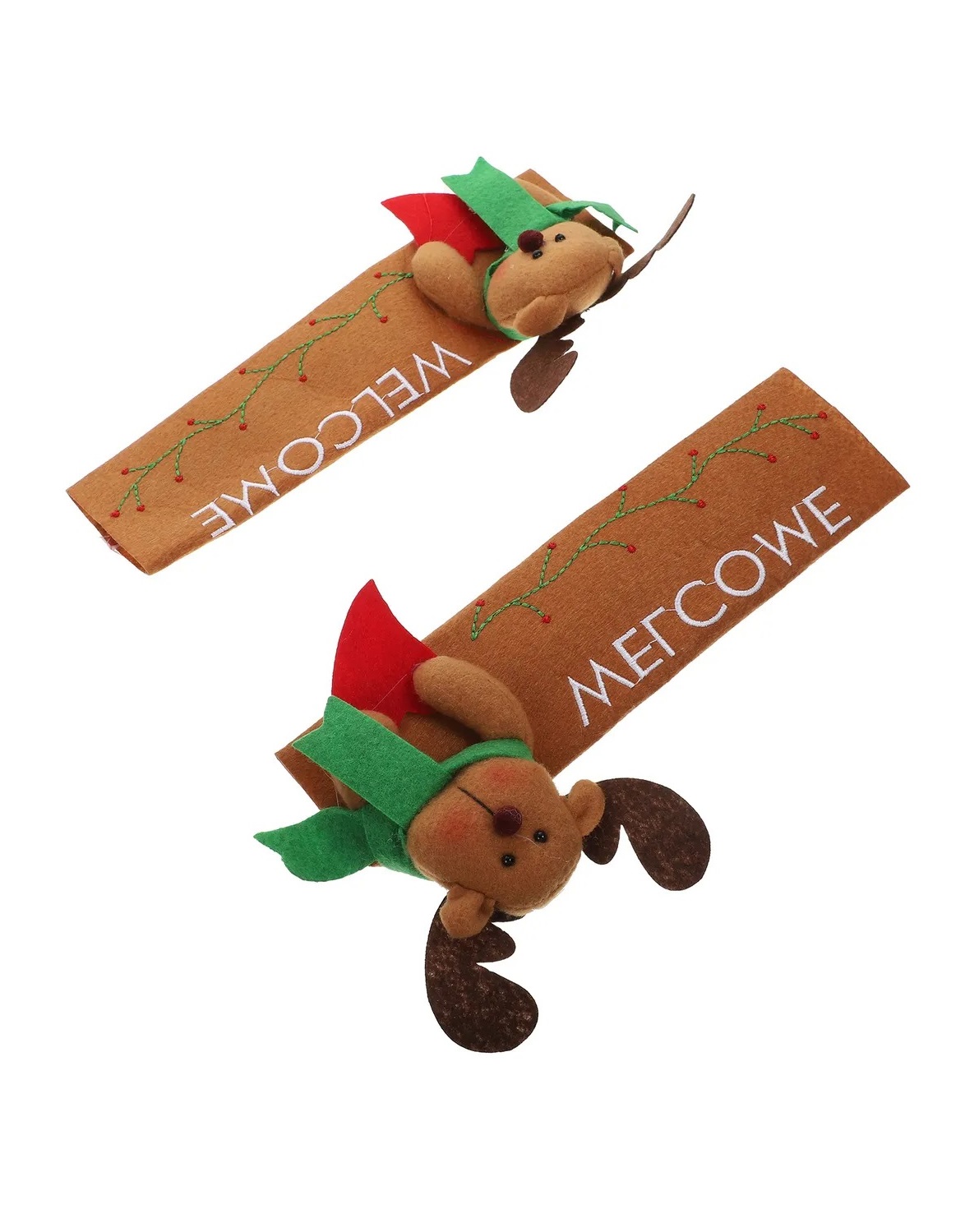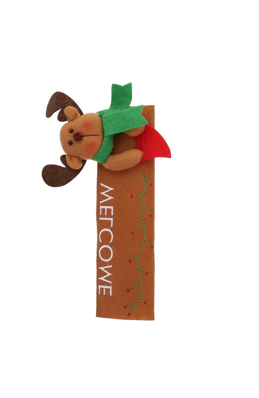This image shows a cute, festive felt decoration featuring a small reindeer plush with brown antlers, a green scarf, and a red outfit, playfully clinging to a vertical brown felt strip decorated with embroidered green vines and red berries, along with white stitched text.