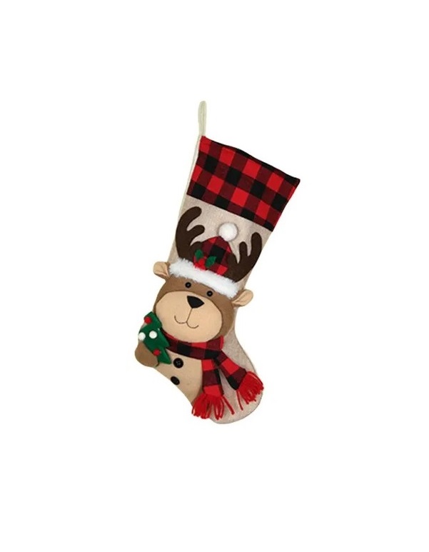 This image shows a festive Christmas stocking decorated with a cute reindeer design. The stocking features a red-and-black plaid top, while the reindeer is adorned with antlers, a cozy scarf, and a small Christmas tree in its hand. Cheerful and colorful, it adds a warm, playful touch to holiday décor.