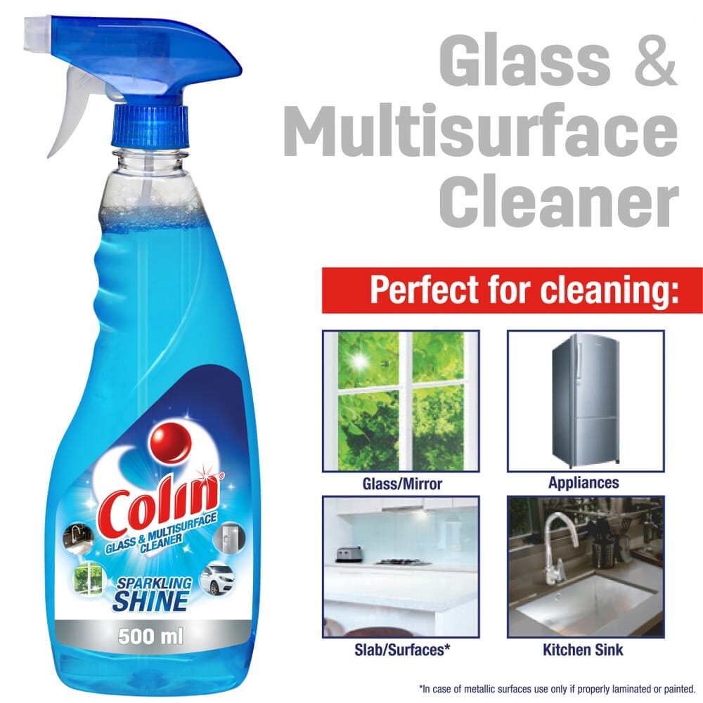 Get sparkling clean surfaces with Colin Glass and Surface Cleaner. Its shine booster formula provides up to two times more shine than regular cleaners. Use it on a variety of surfaces including wash basins, windows, taps, kitchen cabinets, and more. This combo includes a glass cleaner spray bottle and a 1l refill to keep your surfaces clean and shiny. Colin glass and surface cleaner is perfect for use on glass surfaces, wash basins and toilets, window grills and pipes, taps, bath tubs and showers, fridge, oven, kitchen cabinets, ceramic floors and wall tiles.