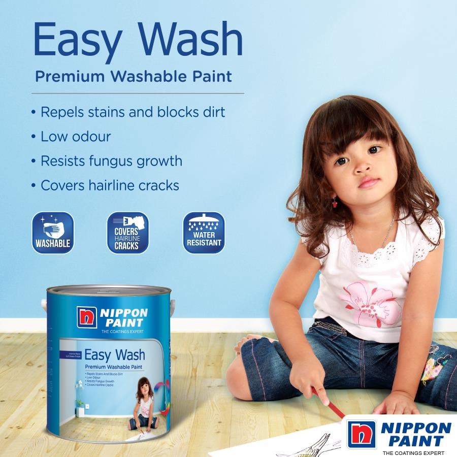 Keep your walls clean with Nippon Paint Easy Wash surface protector technology. This premium washable interior wall paint allows you to wash off dirt and stains easily, more effectively than ever. Easy Wash allows you to freely express yourself. It is resistance to common household stains with anti-fungal properties.