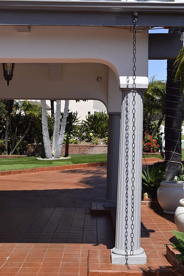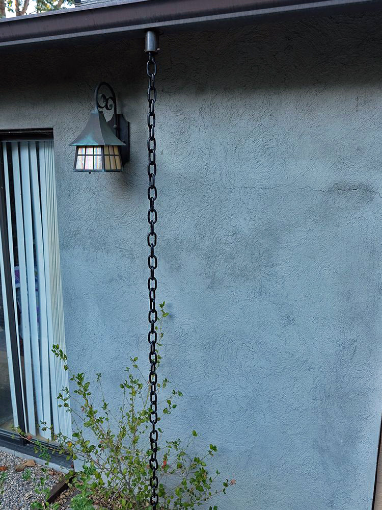 Rain chains work using surface tension. They are connected to gutters, or eaves, usually where a downspout is traditionally placed. As rainwater collects in the gutters and begins to drain, it naturally follows the path of least resistance and follows the chain down to the ground.
