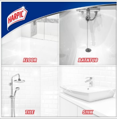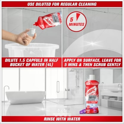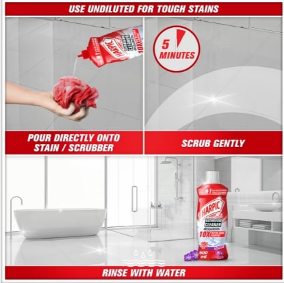 Harpic Bathroom Cleaner is a strong bathroom disinfectant and cleaning liquid that helps remove the toughest of stains. It gives you unbeatable cleaning on greasy soil and particulate matter and freshens the whole bathroom. It has a thick liquid formula with powerful cleaning agents that lift and remove tough stains from almost all bathroom surfaces and kills germs to give you a disinfected and germ-safe bathroom.