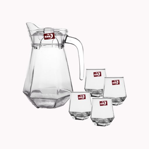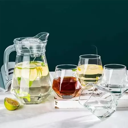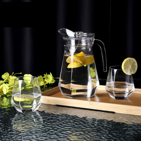 Crystal finish jug and glass set. Constructed with thick high quality tempered glass, that is breakable yet durable. The jug stands on a hexagonal base with a sturdy handle for easy pouring and a cover for straining and protection.