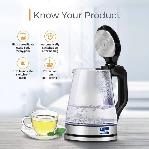 Bring convenience on your kitchen counter with the amazing KENT Electric Glass Kettle. This 1.7L kettle is made of strong borosilicate glass body that easily withstand temperature changes and ensure better visibility. With the power of 1500W, the kettle boils enough water for instant tea, coffee, or soup to serve 4-5 people at a time. The concealed heating plate with a stainless steel cover is for better heat retention. Its auto shut-off feature offers protection against overheating and dry boiling.