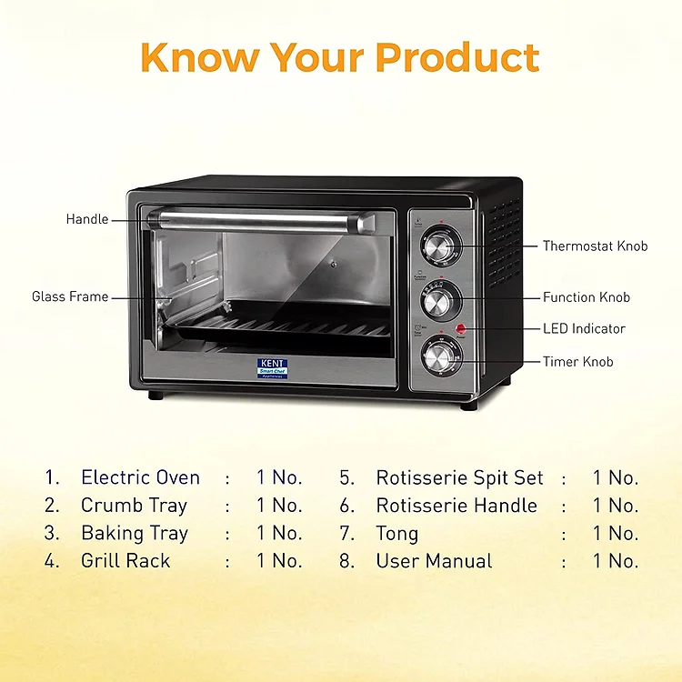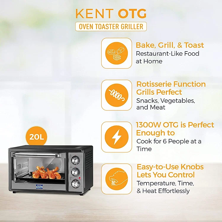 KENT OTG 20L is an exclusive cooking appliance designed to up the smartness quotient of your kitchen. The use of an innovative technology and support of a competent service network has enabled us to create a brand, which is synonymous with your well-being. Continuing with the tradition, KENT introduces the all-new KENT OTG 20L, which allows you to bake, boil, grill and roast. It is a 1300 Watts heavy duty product with easy to use knobs that allows customized cooking sufficient for 6 people. It will let you explore recipes and cook up a delectable meal, in a jiffy. With its sleek stainless- steel design, KENT OTG 20L will let you control the temperature while cooking. The rotisserie and convection modes ensure that you cook so perfectly that your food matches even the best of restaurants.