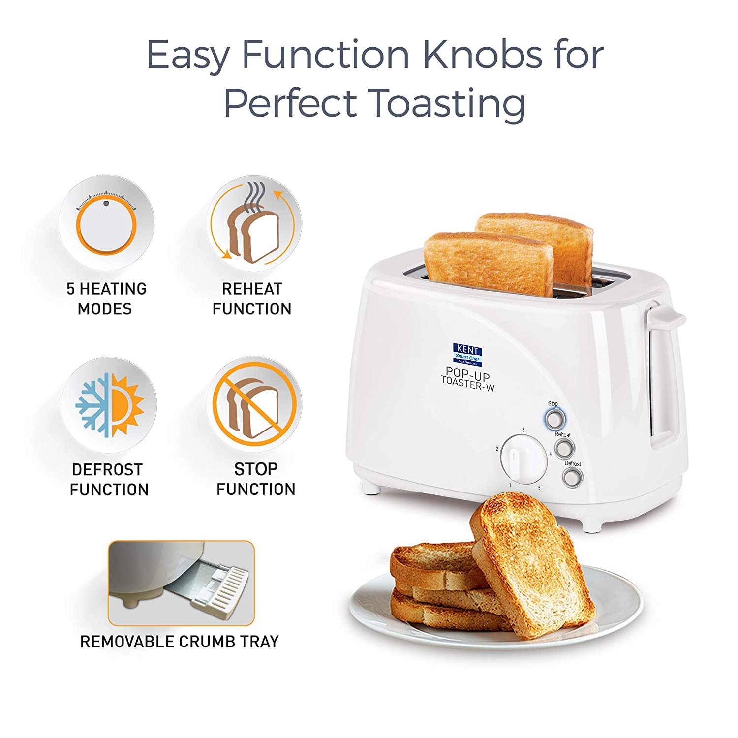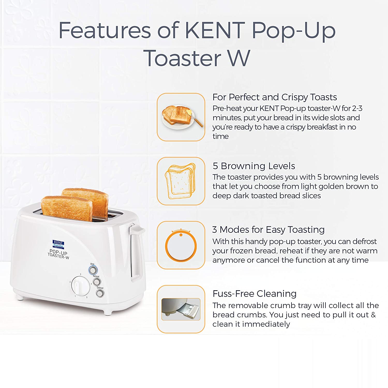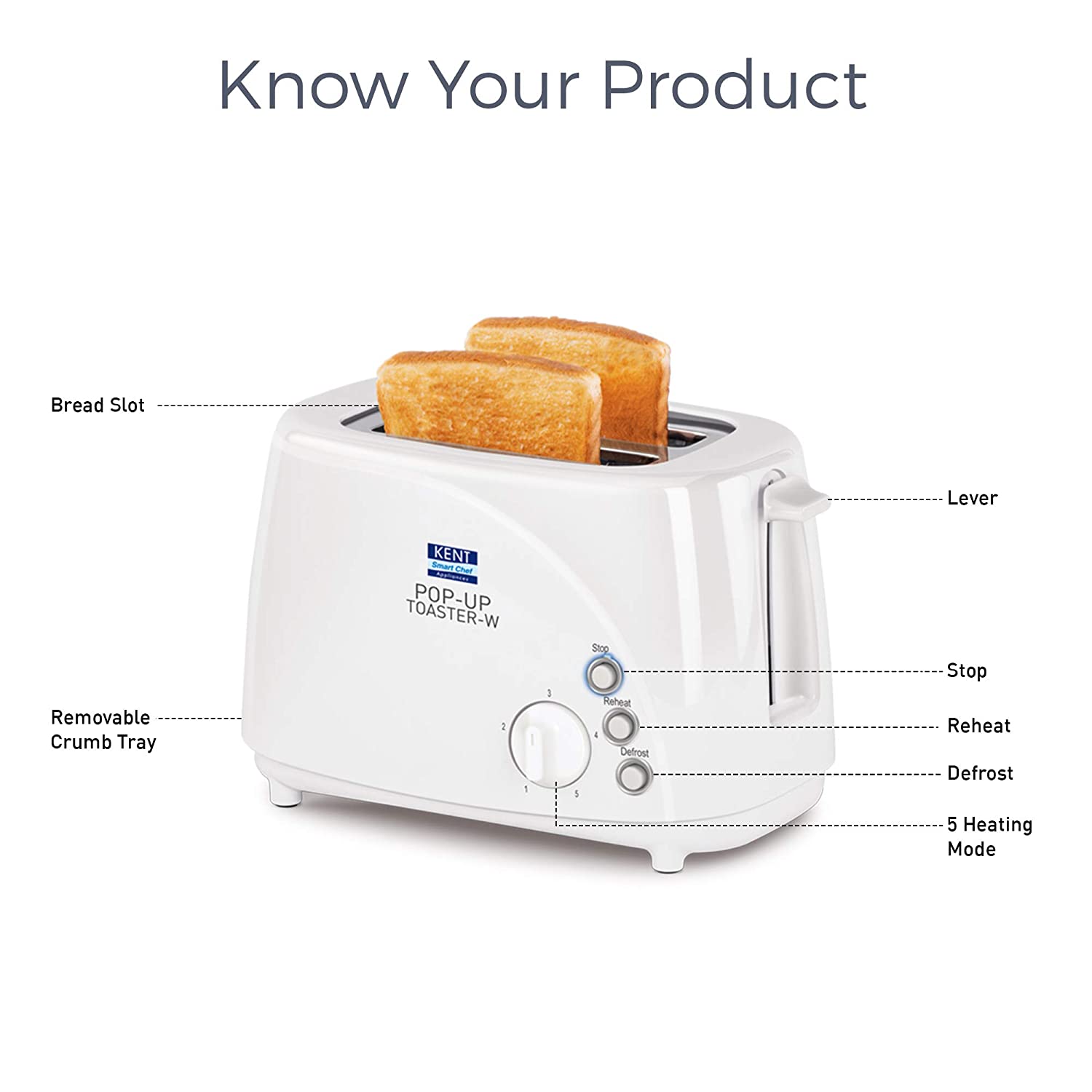 A perfect companion for your rushed-up morning time, KENT Crisp Pop-Up Toaster works like a pro. A super convenient appliance that comes with wide slots for toasting 2 breads at a time, so you can easily have a quick & satisfying breakfast in minutes. It is designed with 6 heating modes, to help you choose your choice of crispiness and colour of bread. With its Reheat Function, one can warm the cold toast instantly, and use the mid cycle cancel/stop function for stopping the process in between, any time. Also, the product ensures trouble-free cleaning, simply take out its removable crumb tray and clean it.