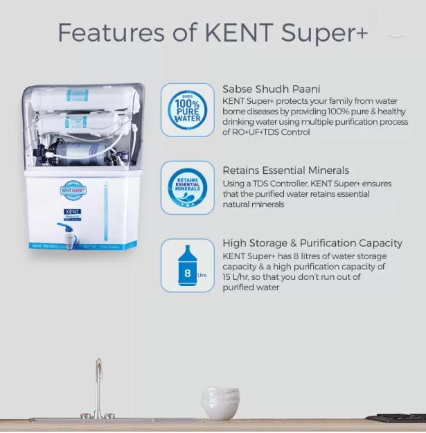 KENT’s compact RO Water purifier- KENT Super+ uses multiple purification process of RO+UF+TDS Control to provide 100% pure drinking water. Stylishly designed as wall mountable, this purifier utilises KENT’s Mineral ROTM technology to retain essential natural minerals in the purified water using a TDS Controller. Suitable for purifying brackish, tap water and municipal water supply, this purifier is ideal for domestic purposes.