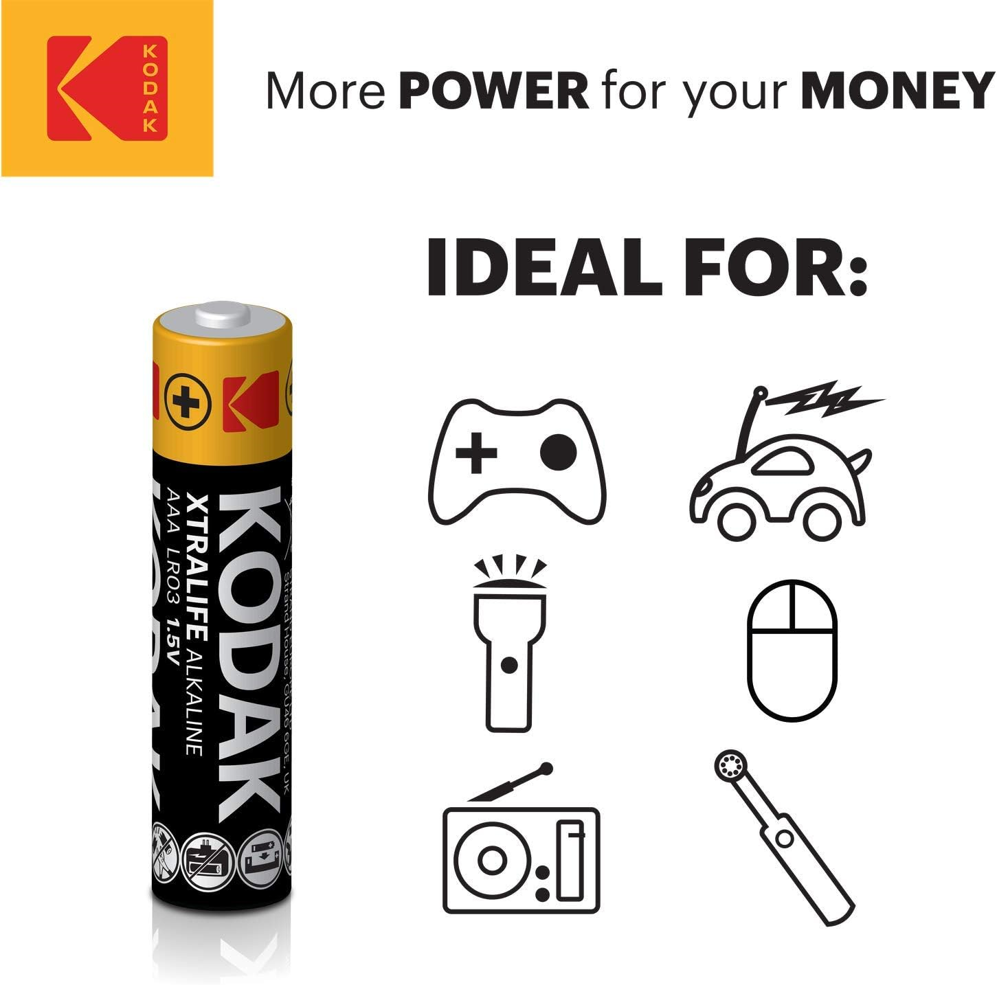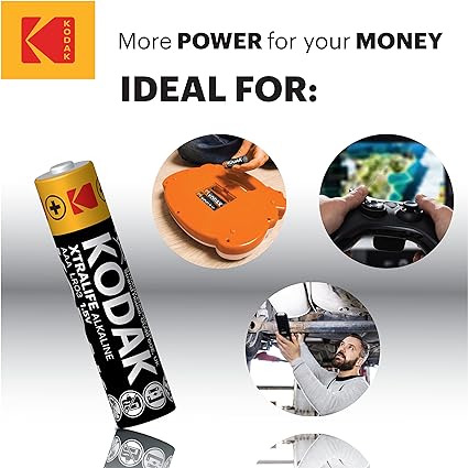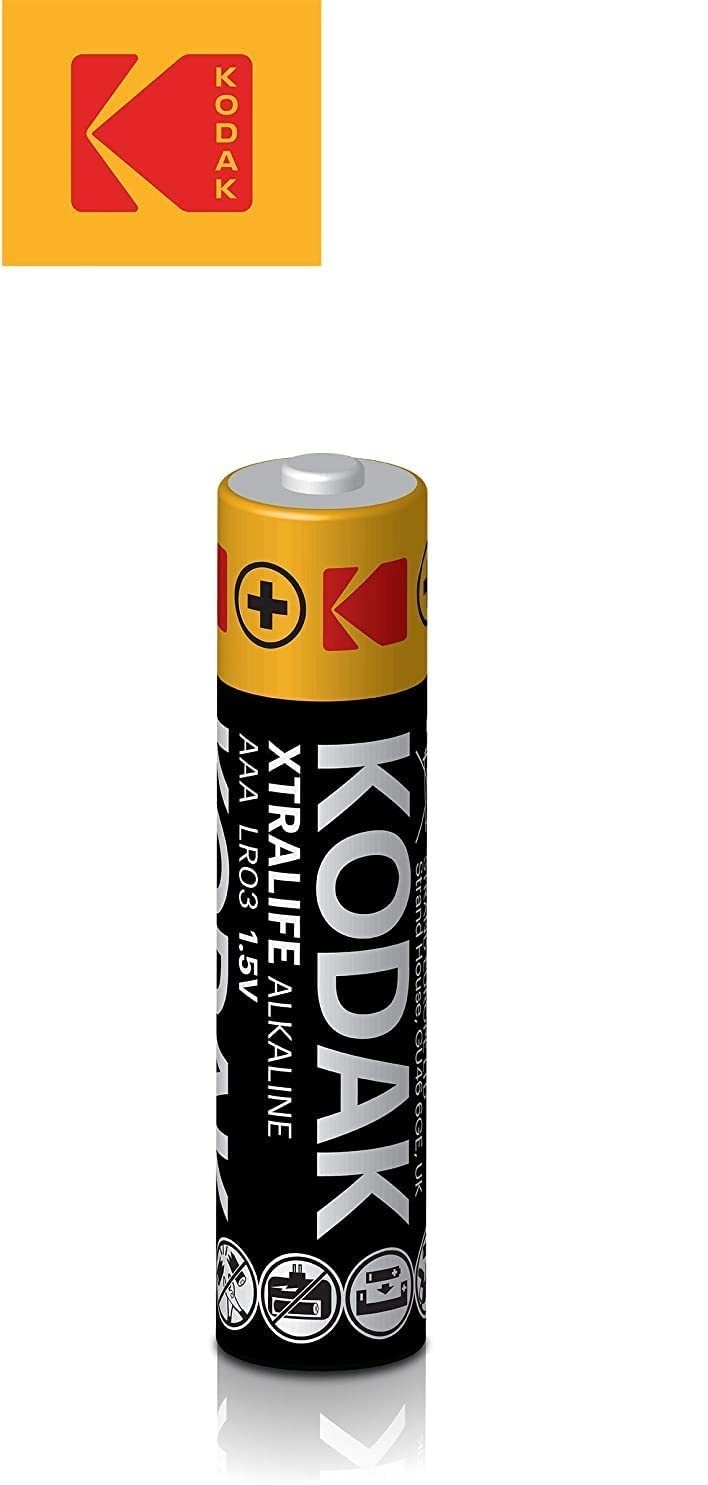 Kodak triple AAA batteries offer premium high-capacity alkaline batteries to supply maximum power for all your disposable battery needs whilst offering 10 year shelf life for optimal power if stored correctly Unlike Rechargeable Batteries AAA Kodak Alkaline Batteries are one of the UK’s leading brands. Ideal for high-drain performance devices & low-drain outdoor devices, offering 12x more power over our zinc batteries Kodak strong batteries AAA pack are leak-proof/leak-resistant, Mercury-free, Cadmium-free & Lead-free – & meets all safety and environmental regulation, protecting your electronic devices all year round Our AAA battery Ideal everyday devices – like electronical toys, remote controlled cars. Walkie talkies radio’s, Flashlights, Audio equipment such as Radio, Speakers, Headphones, LED sensor lights, Alarm systems, Lights, Mice & Keyboard, Bike Lights, Clocks, Scales With more than 50 years of experience, Kodak 3aaa batteries is a leading battery expert and one of the world’s largest manufacturer offering a comprehensive range of batteries and battery-related products