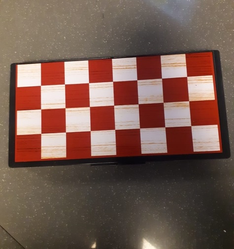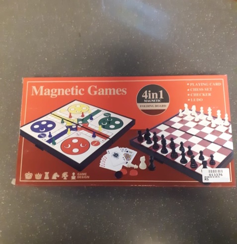 4 games in the travel case: Chess, checkers, ludo, and card Game. Chess is a board game for two players. It is played on a square board, made of 64 smaller squares, with eight squares on each side. Each player starts with sixteen pieces: eight pawns, two knights, two bishops, two rooks, one queen and one king.
