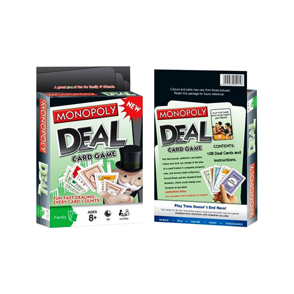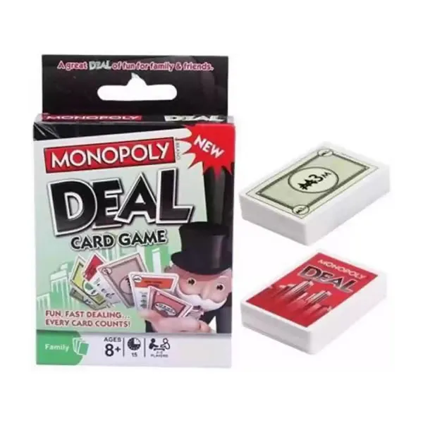 Monopoly Deal Card Game is a fast-paced, exciting twist on the classic Monopoly board game. Designed for 2 to 5 players, this card game combines strategy and luck as players collect property sets, steal from opponents, and use action cards to gain advantages. Each game is quick, typically lasting around 15 to 30 minutes, making it perfect for family game nights or casual gatherings. The compact size allows for easy portability, so you can enjoy Monopoly Deal anywhere. Experience the fun of Monopoly in a new and dynamic way with this engaging card game!