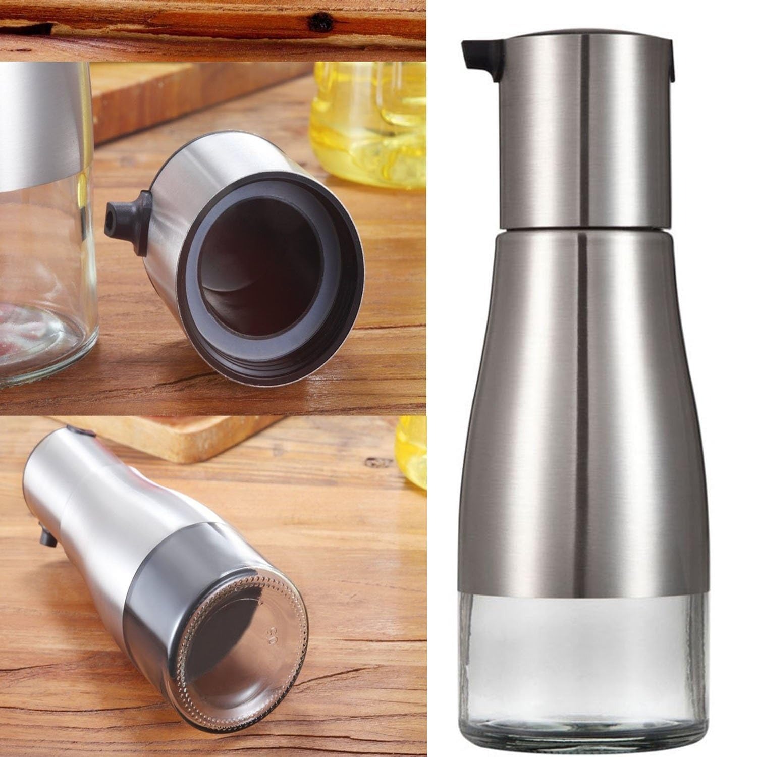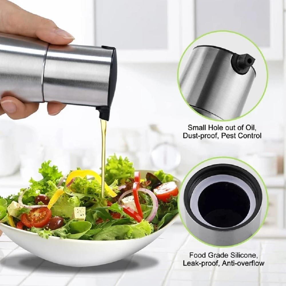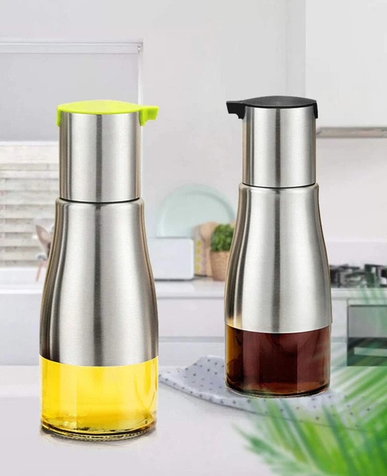 Glass bottle body and stainless steel material accurately fitted, beautiful and practical used for cooking and salad etc. The Soft leather ring, good sealing, unique anti drop oil leakage nozzle, accurate oil control. Provide a stainless steel funnel, easy to reuse. ideal for storing and keeping oil at Hands. Drip pouring spout stops oil from dribbling down the side of the bottle, always keep your kitchen clean and tidy. Keep your olive oil/vinegar fresh, tight-fit lid.
