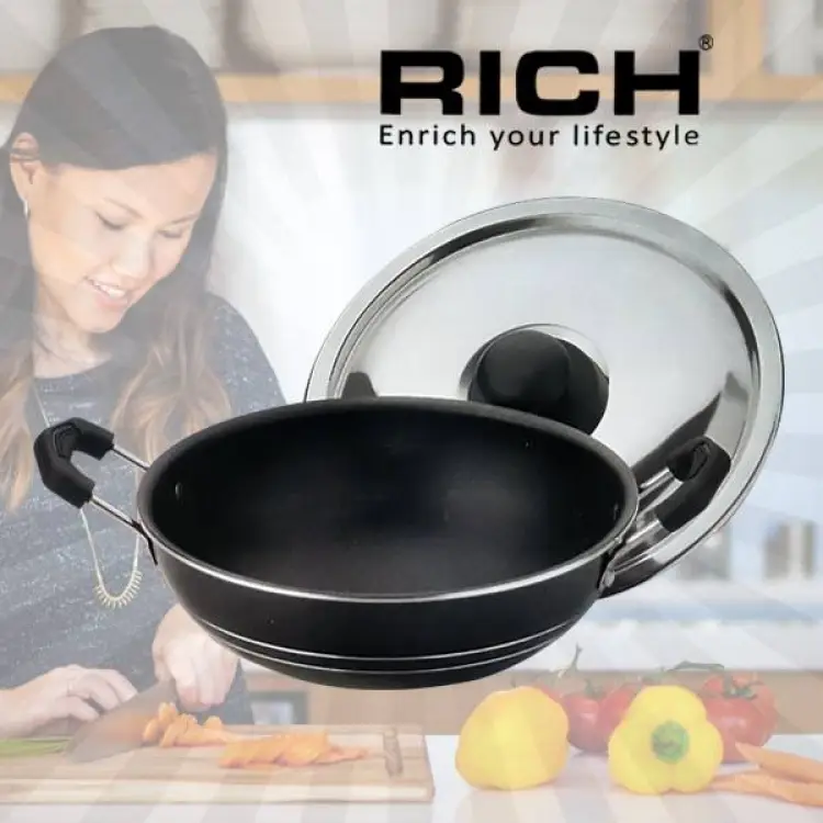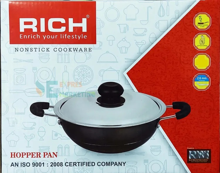 Rich Hopper Pan With Stainless Steel Lid – RHHP-742Rich Hopper Pan is Hygienic, Durable & Thermal efficient. which is  Non-toxic & Non-reactive with foods that makes the food healthier. The riveted handle which is fixed is easy for use and gives extra strength to the handle. the same amount of heat distributes throughout Which makes cooking easier and faster.Rich World international, a name identified with the superlative quality.