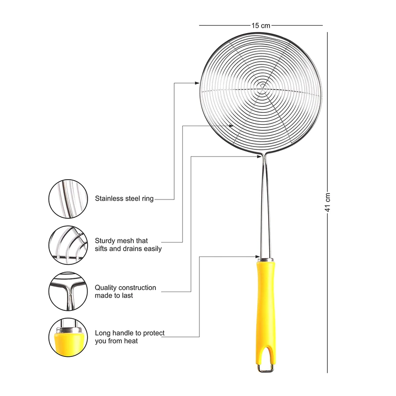 Made Of High-Quality Stainless Steel. A strainer Is An Essential Tool In Our Kitchen. This Strainer Is Very Convenient To Use For Your Kitchen And Is Perfect For Sifting And Straining Wet Or Dry Ingredients. This Strainer Is Used To Fry Momos, Puri, Pasta, Fish, French Fries, Vegetables, Etc. The Long Handles Protect Your Hands From Hot Grease And Oils. It Strains Every Drop Of Oil Or Liquid.This Product Last For A Long Duration Of Time.