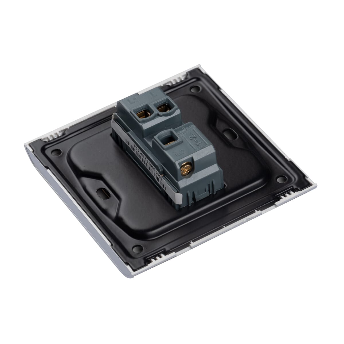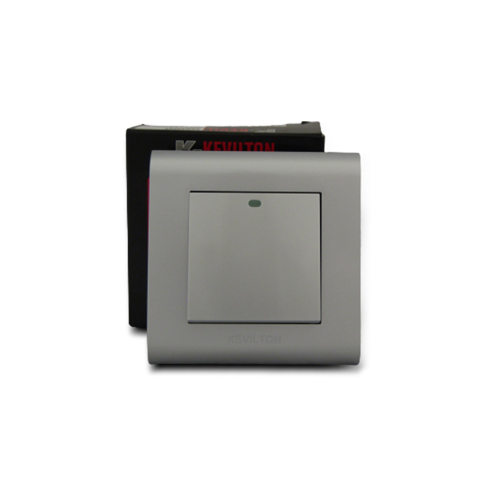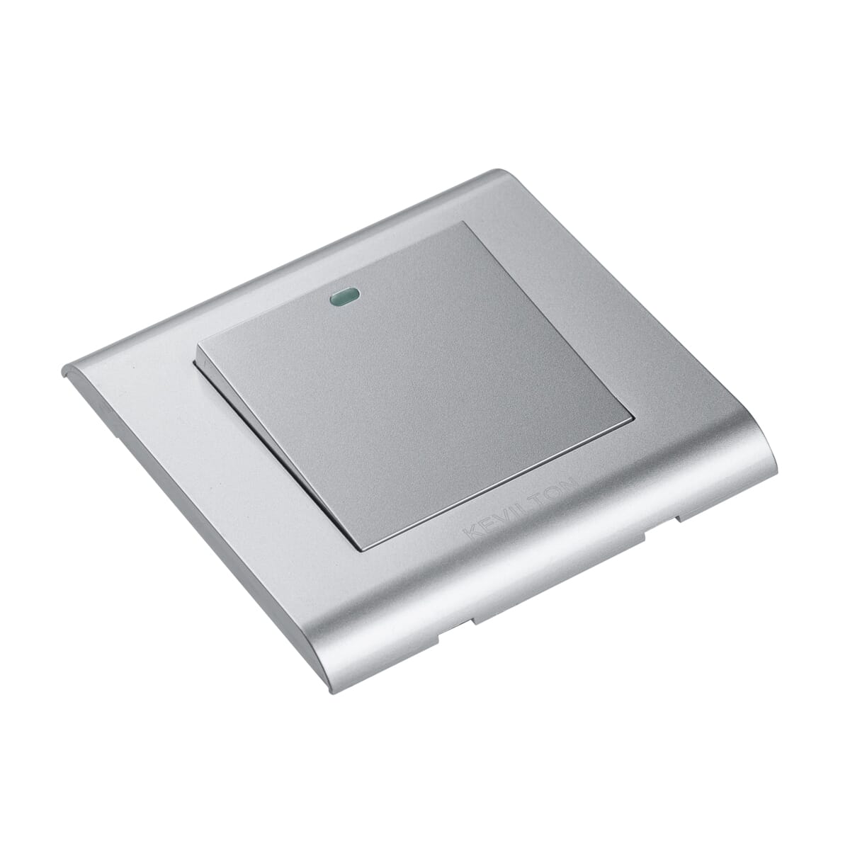 Product with a Silver front face and one ON/OFF dolly to operate a light bulb with integral rocker design of switch with green indicator on switch cap.
