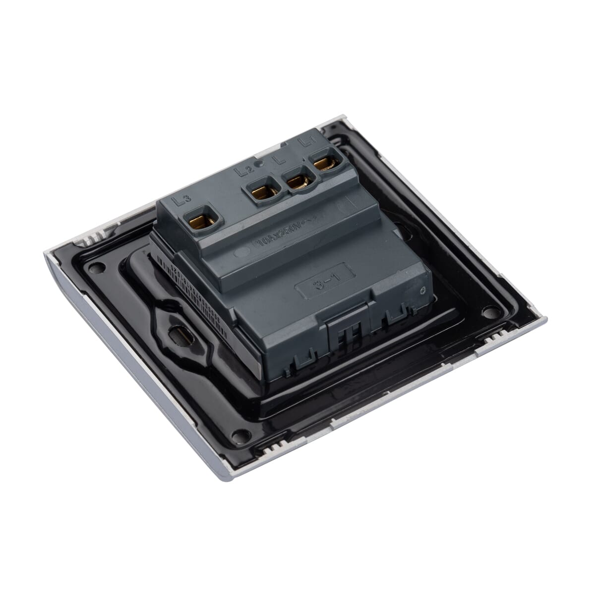 Product with Black colour front face and three ON/OFF dollies to operate light bulbs are Internally looped terminals in multiple gangs to save installation time & cost.