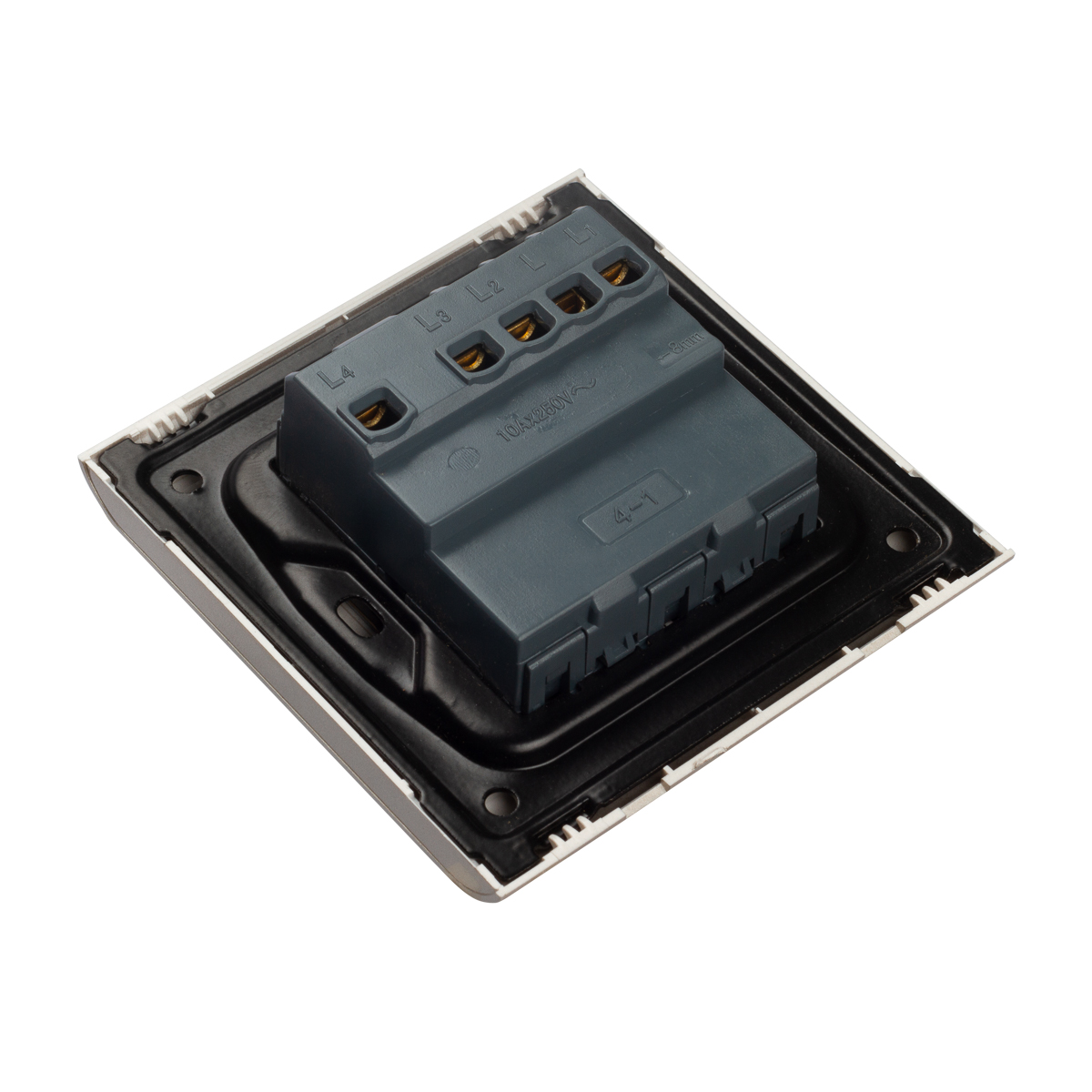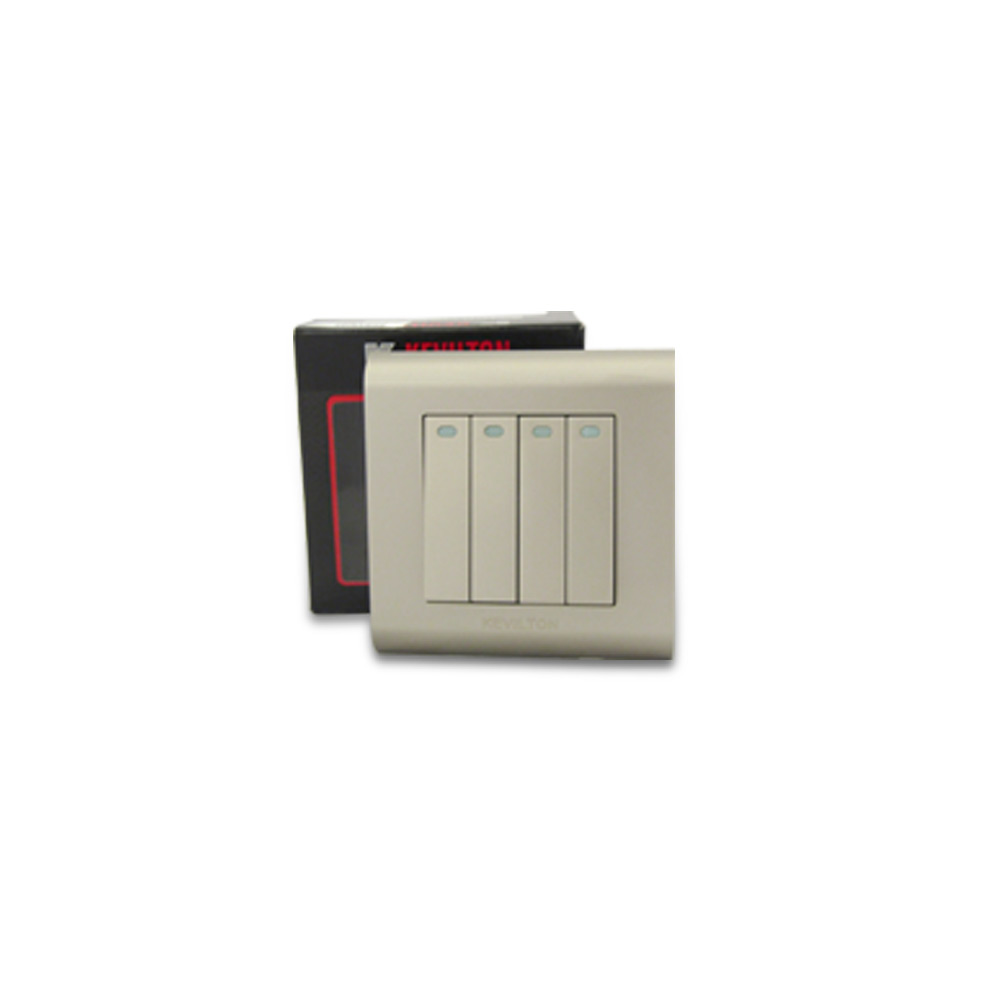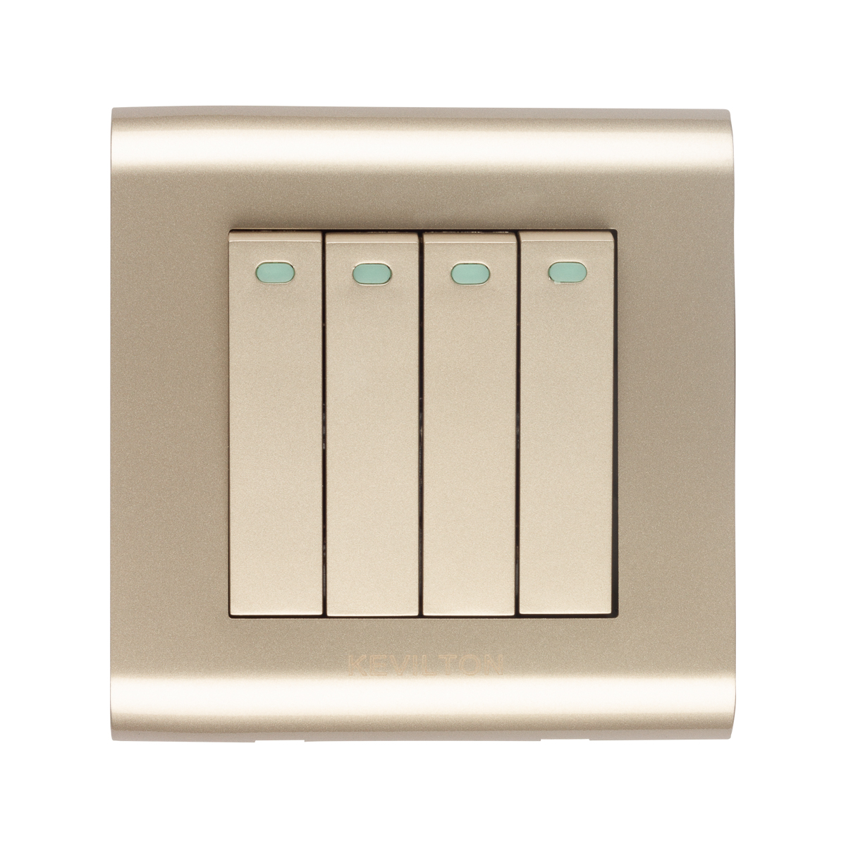 Product with Gold front face and four ON/OFF dollies to operate light bulbs with integral rocker switch design with green indicators on switch caps.