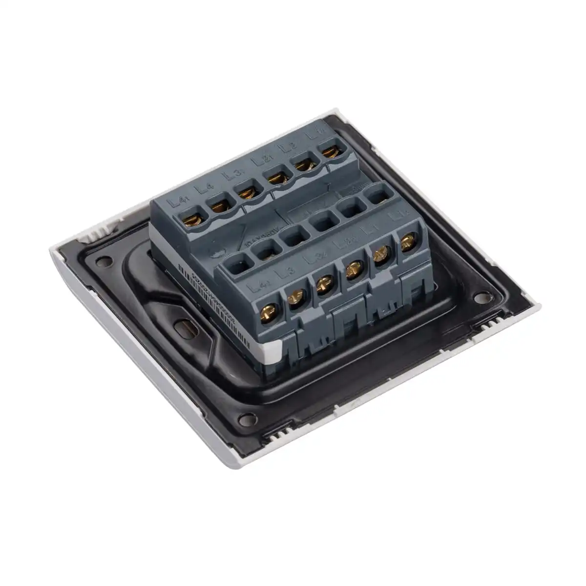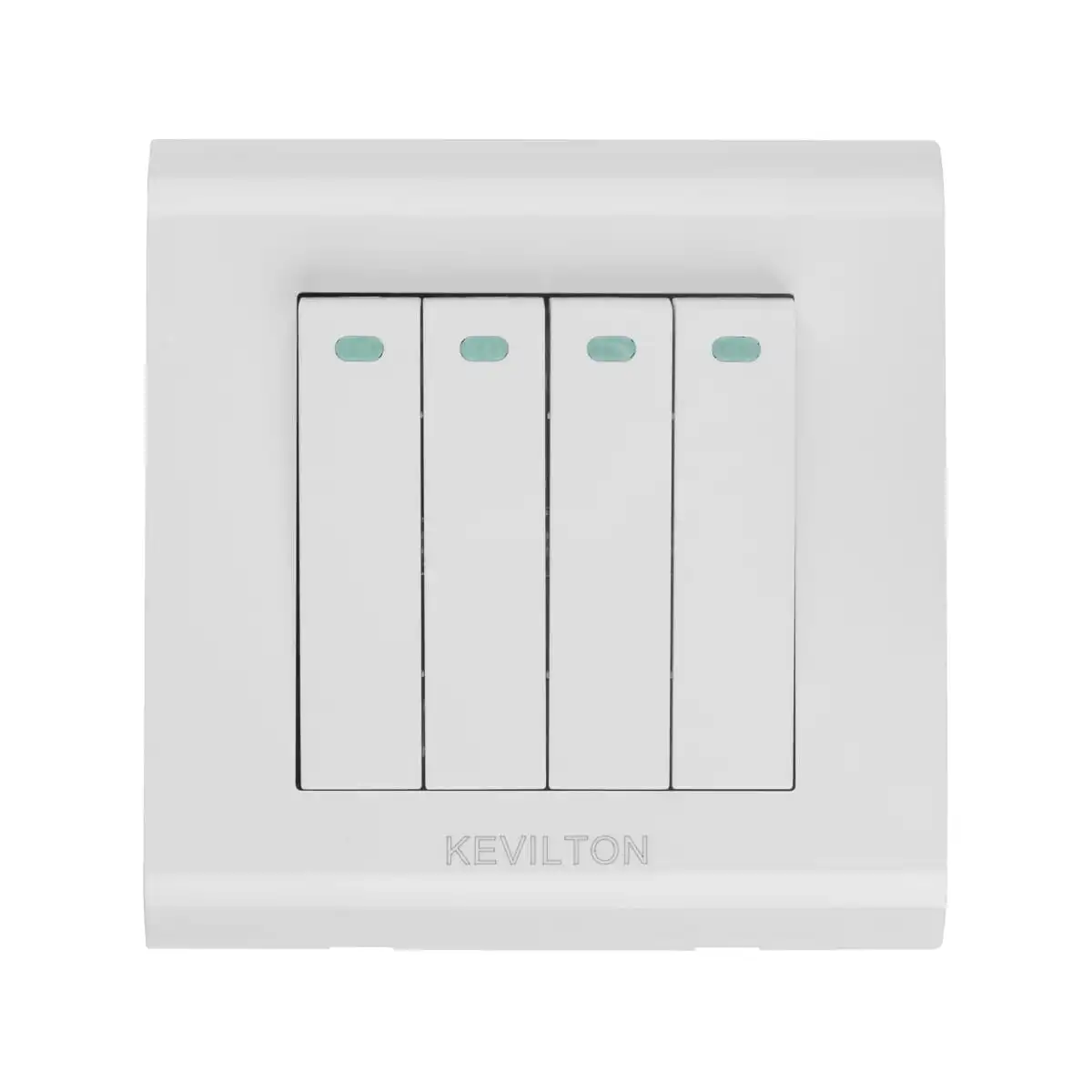 Integral rocker switch design with green indicators on switch caps with internally looped terminals in multiple gangs to save installation time & cost.