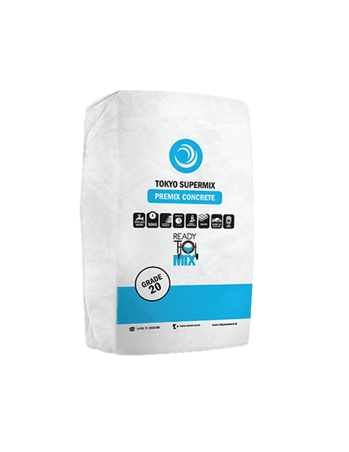 Consists of a mix of river sand, metal aggregate (5 — 20mrn) by weight basis and cement in separate bags. Only necessary to add required quantity of water to make a workable concrete mix. Equivalent concrete grade is G20 and TOKYO SUPERMIX PREMIX CONCRETE can be used for slabs, driveways, pavements etc. Available in 50kg bags. 30 bags can cover an area of 10ft x 10ft with a thickness of 0.25ft. Other strength grades of concrete can be supplied upon request.