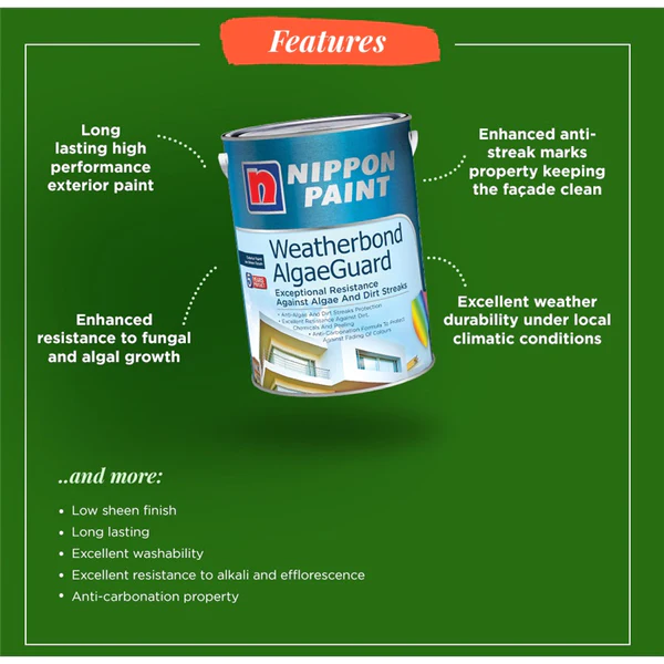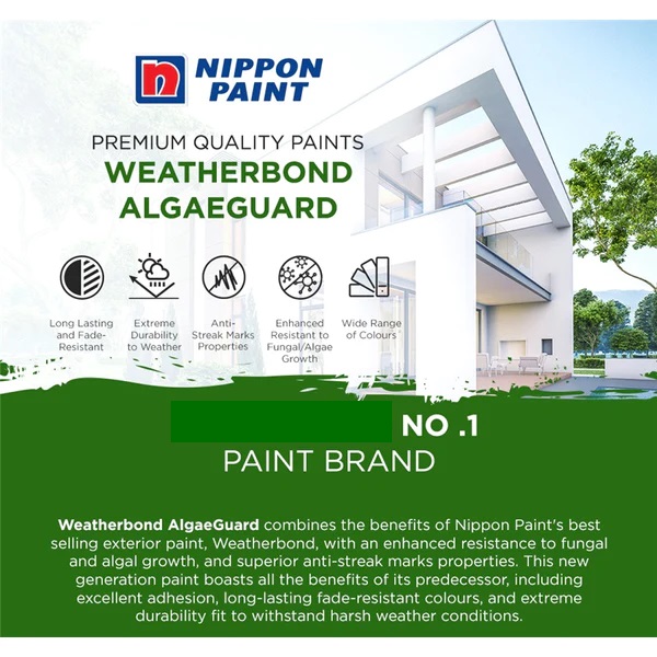 Nippon Weatherbond AlgaeGuard is a long lasting high performance water-based acrylic exterior paint specially formulated with enhanced anti-algae and anti-streak marks performance . It provides ultimate protection to your walls against harsh weather conditions such as the extreme heat and rain experienced in tropical countries like Sri Lanka.