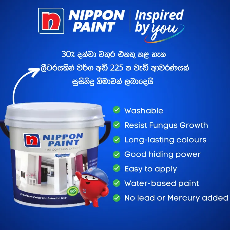 Nippolac Emulsion is an interior paint with a low sheen, washability , good covering and resistance to alkali and fungus. It is suitable for all normal interior masonry surfaces including brickwork, plaster, cement, asbestos and wallboards.